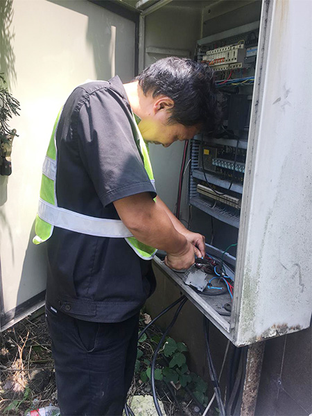 圖為修復后的隧道口路燈 對于修復被盜電纜,一般最直接的做法是重新再拉一根新電纜至配電箱,利用箱內現成的控制開關和交流接觸器等元器件,完成整個電纜連接工作,但中心隊員考慮到此種方法不僅工作量大,修復成本高,而且存在再次被盜的可能性,如果用鋁線代替,電力傳輸又要大打折扣。于是,他們另辟蹊徑,計劃從剩余配電箱至路燈還有200余米未被盜取的電纜中截取一段,直接和洞口情報板電纜相接,這樣既能節省人力、物力,又能以最快速度恢復路燈正常工作。 當天一早,中心隊員帶上相應的工具和設備直奔現場,在確認電纜位置及走向后,便著手抽離洞內電纜。考慮到洞口到配電箱電纜至少有100余米,電纜溝下面又鋪有其他眾多電纜以及之前掉落的垃圾,直接從洞口抽離根本無法動彈。于是,中心4名隊員便每隔10米左右用撬棍撬開上面水泥蓋板,整個人跳進電纜溝內,彎著腰一段一段抽離。抽到最后一個溝時,4人頂著烈日,齊力把重達近百斤電纜抽離整個電纜溝并放置在護欄內側草地上,隨后再從抽出的這段電纜中剪取適當長度,重新鋪設后與寧向出洞口的情報板電纜相接。 臨近中午,戶外溫度不斷升高,中心隊員早已濕透衣背,為趕在一天中最熱的時間點前完成任務,4名隊員臨近解決午餐又迅速奔赴現場,拆除原配電箱內的舊器件,將其用回到新的供電線路中,而多余的器件則捆綁打包帶回中心以留備用,節省公司后期維養成本。 下午1:40,經過通電測試,9盞路燈全部恢復正常工作。集團總工程師江輝在工程部微信群里肯定了中心工作,并提醒一線人員切記做好防暑降溫工作,注意自身身體狀況。