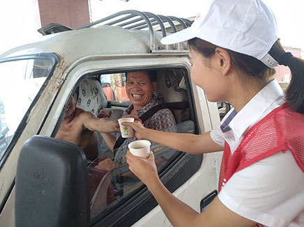 圖為志愿者給司乘人員送上綠豆湯