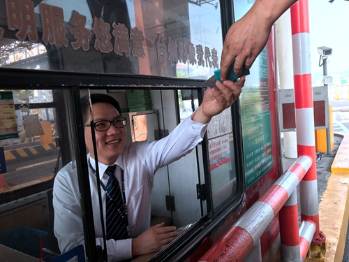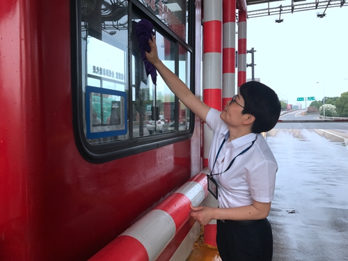 圖為工作人員打掃收費崗亭衛生