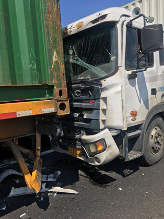 上圖為事故車輛 當天中午,在副站崗亭旁站的工作人員發(fā)現該所前方出口不遠處有貨車停在那里不動,以致后面車輛無法通行。工作人員隨即跑到前方查看情況,原來是三輛貨車發(fā)生追尾,其中有一輛車車頭被撞得凹陷,擋風玻璃也被撞碎,在了解事故現場無人員受傷后,工作人員馬上向監(jiān)控中心匯報情況。由于事故車輛較大面積滯留,導致后方車子堵到主線上,一些不明情況的駕駛員在車里使勁按喇叭催促,現場充滿焦躁情緒。 如何盡快疏通道路?正在食堂吃飯的一班班長潘慶耀放下碗筷跑到事故現場,同工作人員叫前面受損較少的事故車輛先把車子開出收費站,再讓第三輛受損嚴重的車子試著發(fā)動車子開出去,所幸三輛車子都能開離車道。在將地上的破損碎片清理到車道兩旁后,工作人員繼續(xù)指揮車輛向前行駛,收費內廣場在較短時間內恢復了正常通行。 沈芬芳