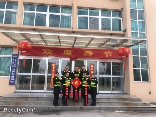 圖為布置好的辦公樓現(xiàn)場 下午,大家對管理房辦公樓道的蜘蛛網(wǎng)進行了清理,對大門口進行布置:掛起燈籠、貼上對聯(lián)、拉好橫幅和彩旗。考慮到春節(jié)期間保潔員放假,生活垃圾較以往會有所增加,特在各角落多增放了幾只垃圾桶。 負責(zé)掃塵的同事認真對待,干勁十足。在大家的共同努力下,經(jīng)過掃塵后的所面貌煥然一新,節(jié)日的氛圍較為濃厚。該所負責(zé)人要求大家尊重今天的勞動果實,春節(jié)期間繼續(xù)做好保潔工作。最后,大家即興在大門口合了影,并送上新年的祝福,擁抱充滿希望的2019年! 夏蓮萍