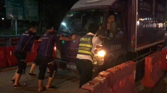圖為收費(fèi)員幫助司機(jī)將故障車輛推出車道 8月15日凌晨1點(diǎn)多,溫嶺西收費(fèi)所征費(fèi)二班安全員在日常巡邏時(shí)發(fā)現(xiàn)一輛小型貨車停在進(jìn)口內(nèi)廣場,在詢問司機(jī)后得知車輛因出現(xiàn)故障導(dǎo)致無法發(fā)動(dòng)。安全員當(dāng)即叫來旁站人員,與兩個(gè)司乘人員一起用力,慢慢地將該車推出車道。在婉拒了司機(jī)遞香煙的好意后,安全員囑咐司機(jī)盡快聯(lián)系人員前來解決,后回到崗位繼續(xù)工作。