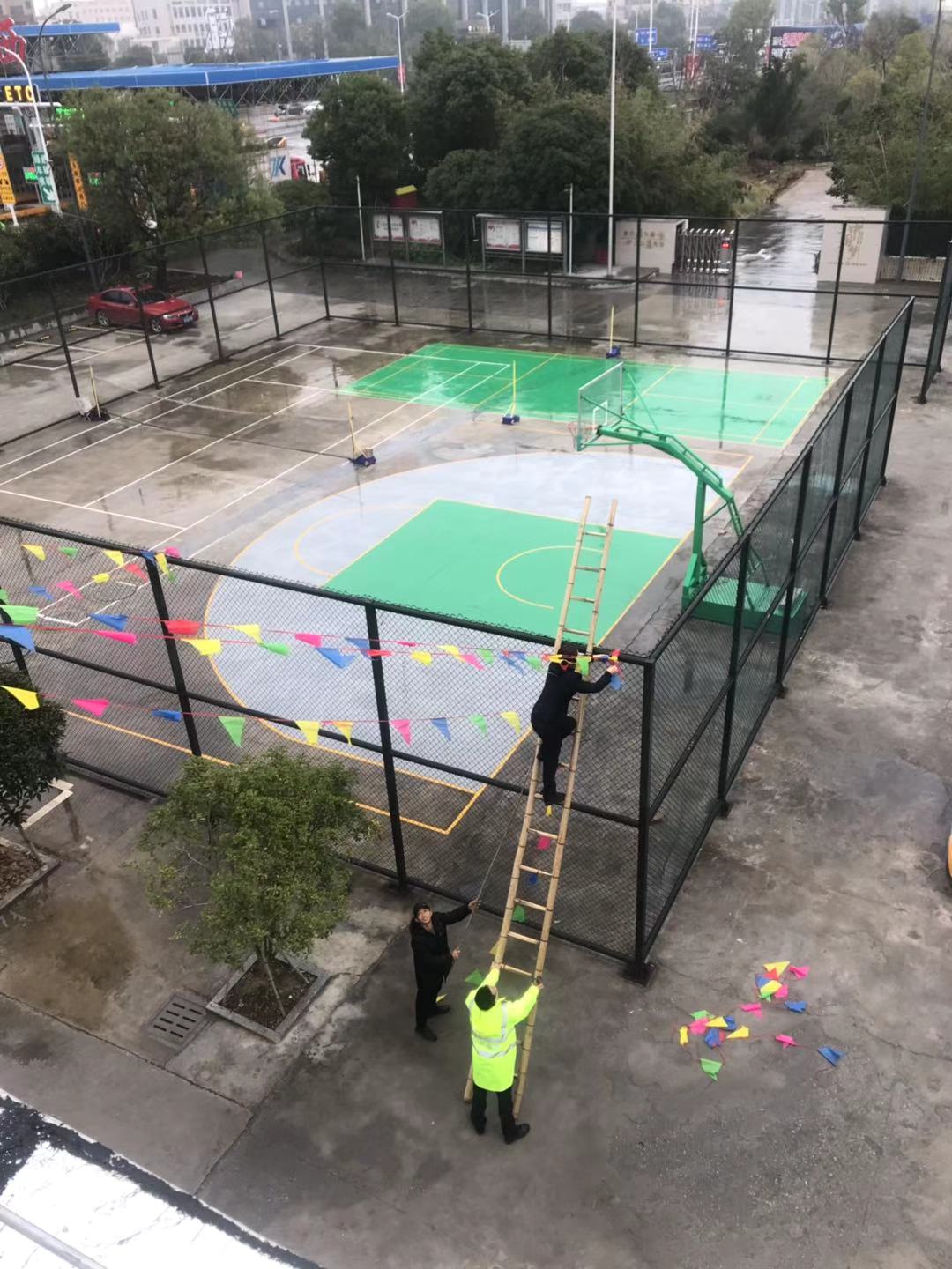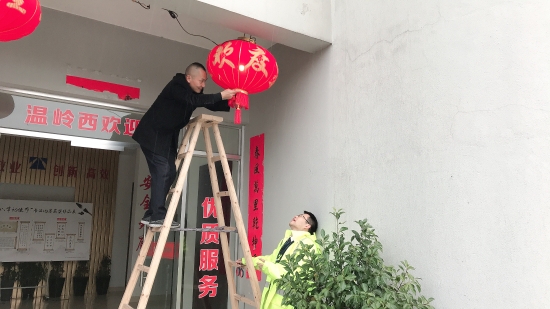 圖為工作人員共同裝扮收費(fèi)所 此次活動,溫嶺西收費(fèi)所本著大氣、熱烈、節(jié)儉的原則,在食堂、辦公樓、操場等區(qū)域掛上燈籠、拉上彩旗、貼上福字和對聯(lián),在收費(fèi)內(nèi)廣場護(hù)欄處插上彩旗,有了這些裝扮,整個站所處處洋溢著喜氣洋洋、新穎美觀的節(jié)日氛圍。此外,員工們還自發(fā)在站所打掃衛(wèi)生清理垃圾,重點(diǎn)對辦公樓、宿舍區(qū)及收費(fèi)崗?fù)ず蛢?nèi)外廣場等區(qū)域的環(huán)境衛(wèi)生進(jìn)行全方位清掃。各班組齊心協(xié)力共同打掃,為春節(jié)掃塵。經(jīng)過大家的努力,整個站區(qū)呈現(xiàn)出整潔優(yōu)美的工作環(huán)境,向過往司乘充分展示溫嶺西收費(fèi)所的良好精神風(fēng)貌。
