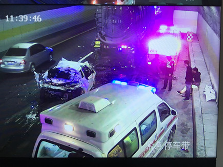 圖為事故現場 情況緊急,一接到指令,巡邏車立即在南廣場調頭,趕赴事故現場。而此時較大的車流量已造成后方堵車,導致巡邏車被堵在隧道口,執勤隊員怕時間耽擱太久,便火速跑到事故現場,第一時間將車里的人員救出。所幸轎車內四人只有一人腳上受傷,中控立即拔打120急救電話。在他們還在施救的時候,追尾事故卻頻頻發生,500米左右、1300米左右的超車道上先后發生兩小車、三車追尾事故,隧道內排起了長龍。為了保證在最短時間內恢復正常通行,執勤隊員忙著奔赴現場指揮預警,應急救援有序展開。 現場,監控中心、交警、執勤隊等部門分工協作,整個施救過程一直持續到中午12點多才順利完成。盡管執勤隊員到現在都滴水未進,但每個人臉上繃緊的神經終于都得到了放松。 林玲