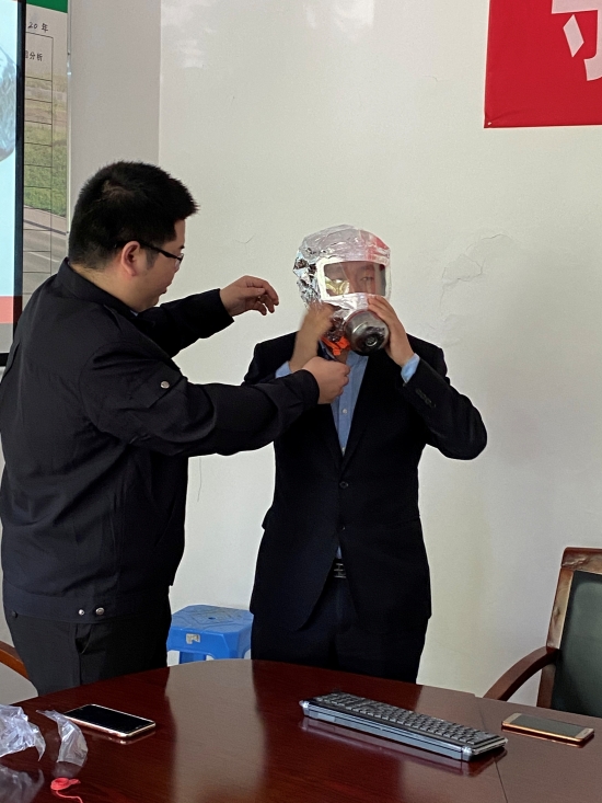 圖為空氣呼吸器佩戴演練 培訓分為講座和演練兩個部分。在培訓課上,臺州消防大隊楊教官結(jié)合近年來發(fā)生在臺州觸目驚心的火災案例,以視頻、圖片的形式生動地闡述了消防安全工作的重要性和嚴峻性,通過現(xiàn)場展示詳細介紹了干粉滅火器、水基滅火器的各自特點和使用方法、適用的場所,全面介紹了日常工作生活中應注意的消防安全細節(jié)以及如何撲救初期火災,火災中如何自救、空氣呼吸器佩戴使用、逃生等知識。