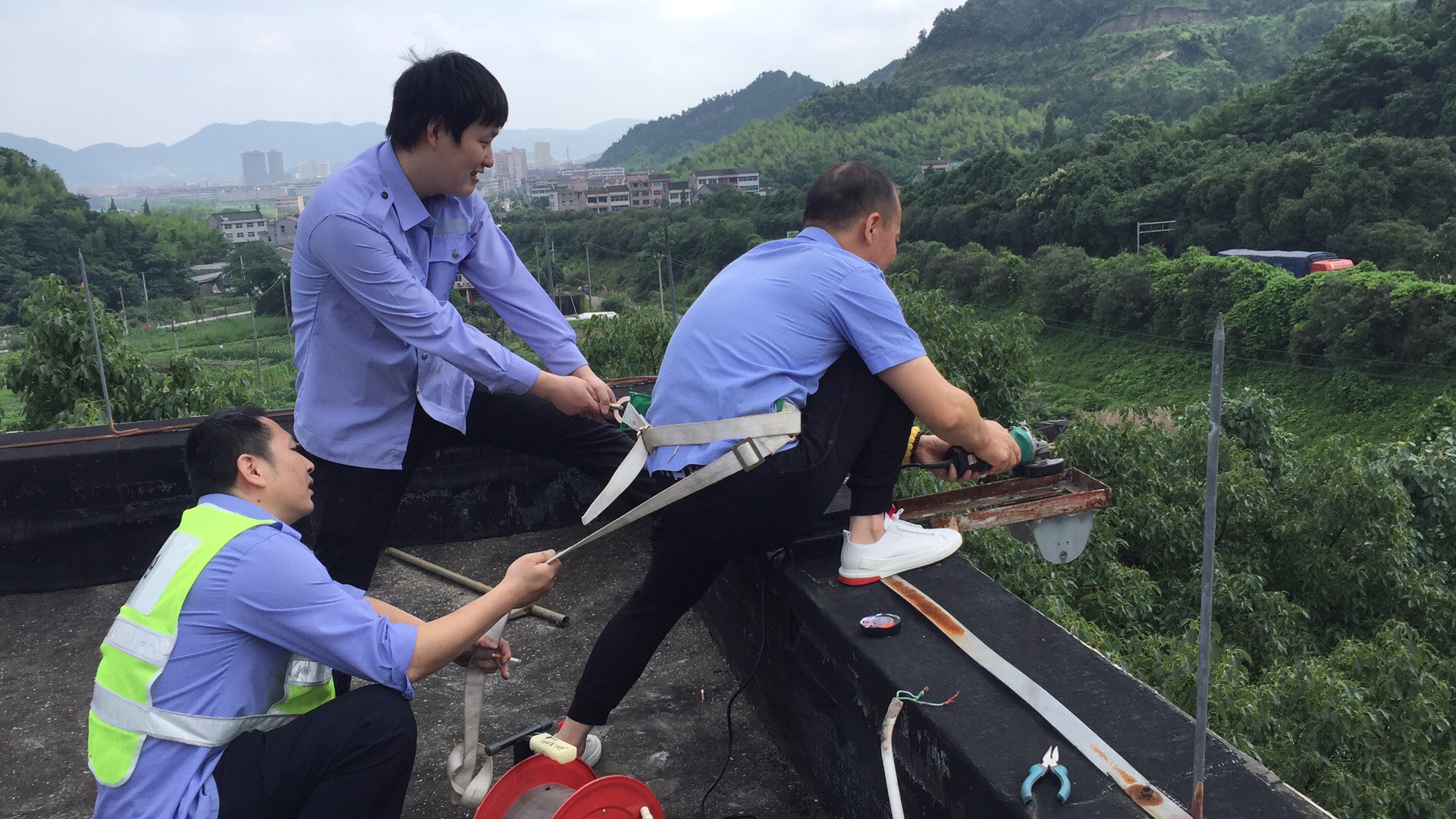 堅(jiān)持優(yōu)良傳統(tǒng),執(zhí)勤隊(duì)員變廢為寶 6月24日上午,乘著難得的晴天,大溪嶺隧道所執(zhí)勤隊(duì)對管理房的標(biāo)牌射燈進(jìn)行更換。 由于射燈需設(shè)置在屋頂,隊(duì)員們需要爬到四樓屋頂。一到房頂,隊(duì)員們傻眼了,原來的高壓鈉燈經(jīng)過風(fēng)吹日曬地早已銹跡斑駁,燈具無法拆卸。面對困難,黨員干部要沖在前,現(xiàn)在唯一的辦法是用切割機(jī)切割,因?yàn)?/span>高空作業(yè)的危險(xiǎn)性,執(zhí)勤隊(duì)長站了出來,腰上綁著安全帶,站在屋頂邊緣作業(yè)。拉著安全繩的隊(duì)員們都為隊(duì)長捏了一把汗,幸好,同事們配合默契,幾個(gè)小時(shí)后順利完成LED射燈更換工作,新?lián)Q上的LED節(jié)能燈,不僅使命壽命長,而且又節(jié)能環(huán)保。