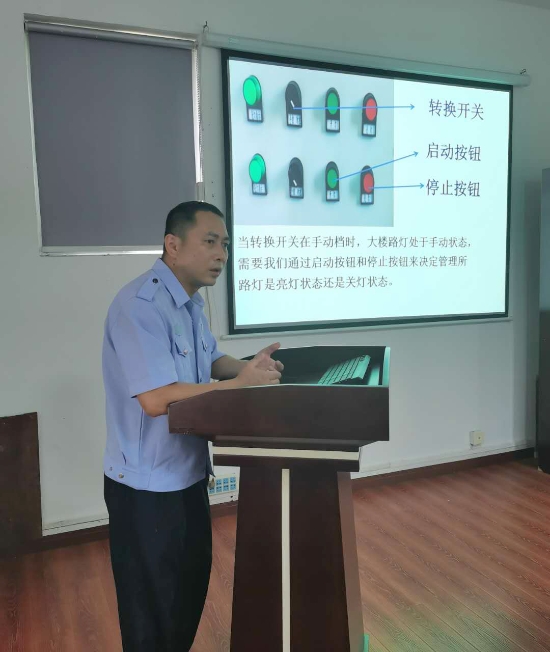 圖為電工業(yè)務培訓現(xiàn)場 湯寧光在電工崗位已經19載,有著豐富的工作經驗。他用聊家常的方式來講解線路控制的工作原理圖、電路的故障排除方法、光控開關的接線方法,PPT課件中配有隧道所配電房中相應的照片和線路圖,并注解,簡潔明了,通俗易懂。在授課過程中,他每講到一處結尾,便與聽課人員互動,現(xiàn)場為大家答疑解惑,課堂氛圍熱烈,互動感很強。