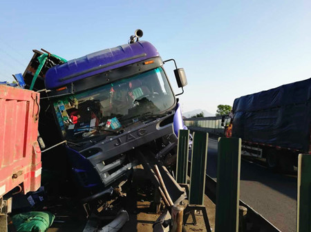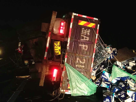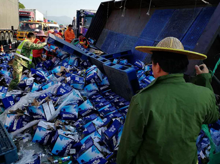 8月25日凌晨4點,甬臺溫高速溫向1648+7路段,一輛運啤酒的大貨車因司機(jī)疲勞駕駛,導(dǎo)致車輛撞上中央護(hù)欄而側(cè)翻,啤酒灑滿一地,后方兩輛貨車避讓不及造成多車事故。