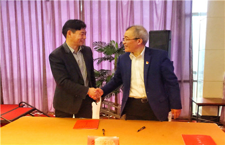 圖為集團副總經理陳保衛與國資委主任徐豪簽訂責任書后握手