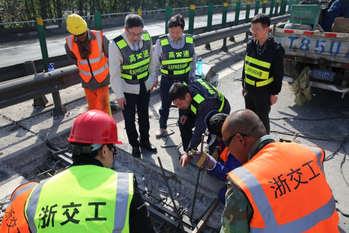 隨后,在伸縮縫型鋼安裝現(xiàn)場,陳文波撿起鑿除的碎渣,查看被鑿除的舊伸縮縫情況。公司所轄路段屬于軟土路基,且有91座橋梁,由于運(yùn)行時(shí)間已20余年,部分橋梁伸縮縫破損較為嚴(yán)重,如何維修橋梁伸縮縫和橋頭跳一直是個(gè)老大難問題。在橋梁伸縮縫修補(bǔ)現(xiàn)場,因?yàn)橹剀嚨哪雺海糠稚炜s縫已經(jīng)磨損嚴(yán)重,所在的混凝土路面只能借助鑿巖機(jī)進(jìn)行作業(yè)。