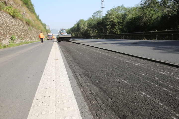 在黃土嶺北洞口附近的路面上,大型履帶式路面銑刨機(jī)銑削開一條寬度為2000mm的路面,散料隨之被迅速輸送到工程運(yùn)輸車上,路面銑刨工作流程有條不紊展開。