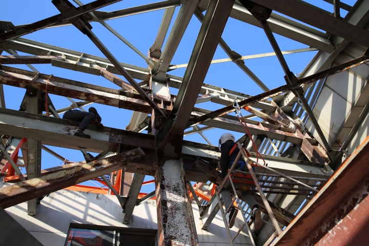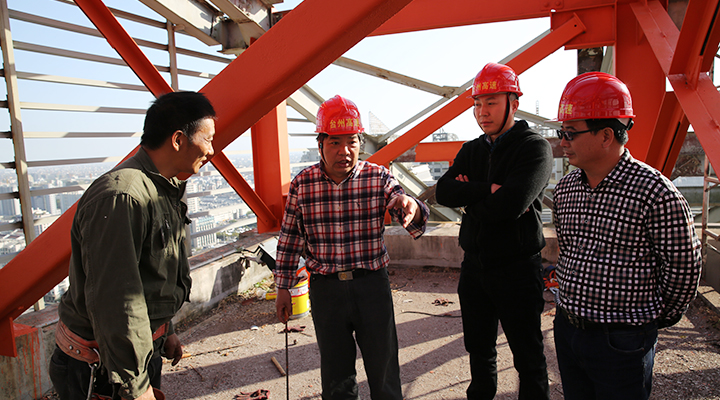 集團安全總監(jiān)項同富檢查天和大廈除銹施工 11月15日下午,集團安全總監(jiān)項同富在辦公室、房產(chǎn)公司相關人員的陪同下,到天和大廈樓頂鋼架除銹施工現(xiàn)場檢查施工進展和安全工作。 集團總部天和大廈樓頂鋼架跨度大,高低水平不一致,很難搭建大范圍的防護網(wǎng)及腳手架等施工輔助工具,也無法采用大型機械打磨除銹的方式除去表面的銹層,只能靠手工和電動角磨機除銹。施工人員常常進行高空作業(yè),安全隱患大。