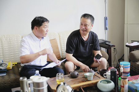圖為老干部陳惠良開心地談股權轉讓事宜
