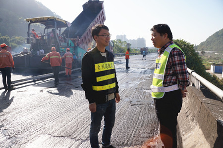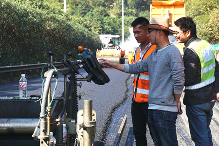 “路面銑刨有時會出現銑刨不完全存在夾層的現象,如不清理干凈則會嚴重影響攤鋪后路面的平整度?!睏罱鹆航榻B道,所以攤鋪時每道工序,他都時刻緊盯,確保攤鋪的路面不存在任何瑕疵。