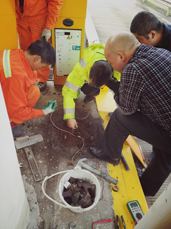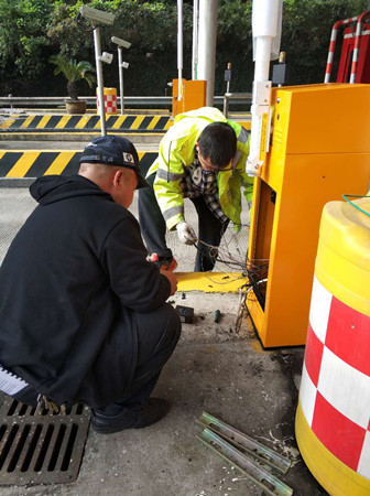 圖為工作人員對新欄桿機(jī)進(jìn)行接線
