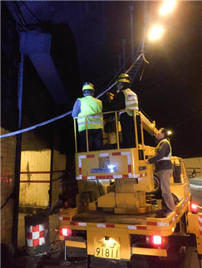 圖為施工人員維修電纜 當(dāng)天早上8時(shí)左右,交警開始組織實(shí)施封道搶修。作業(yè)期間,大溪嶺隧道所堅(jiān)守在北洞口卡口預(yù)警,維養(yǎng)中心班員和專業(yè)搶修人員對(duì)橋架、掛落的電纜和被撞的攝像頭進(jìn)行了應(yīng)急處理與臨時(shí)加固。此時(shí),過往車輛已堵到大溪收費(fèi)所,這時(shí)候,時(shí)間就是速度,速度就是通車效率。