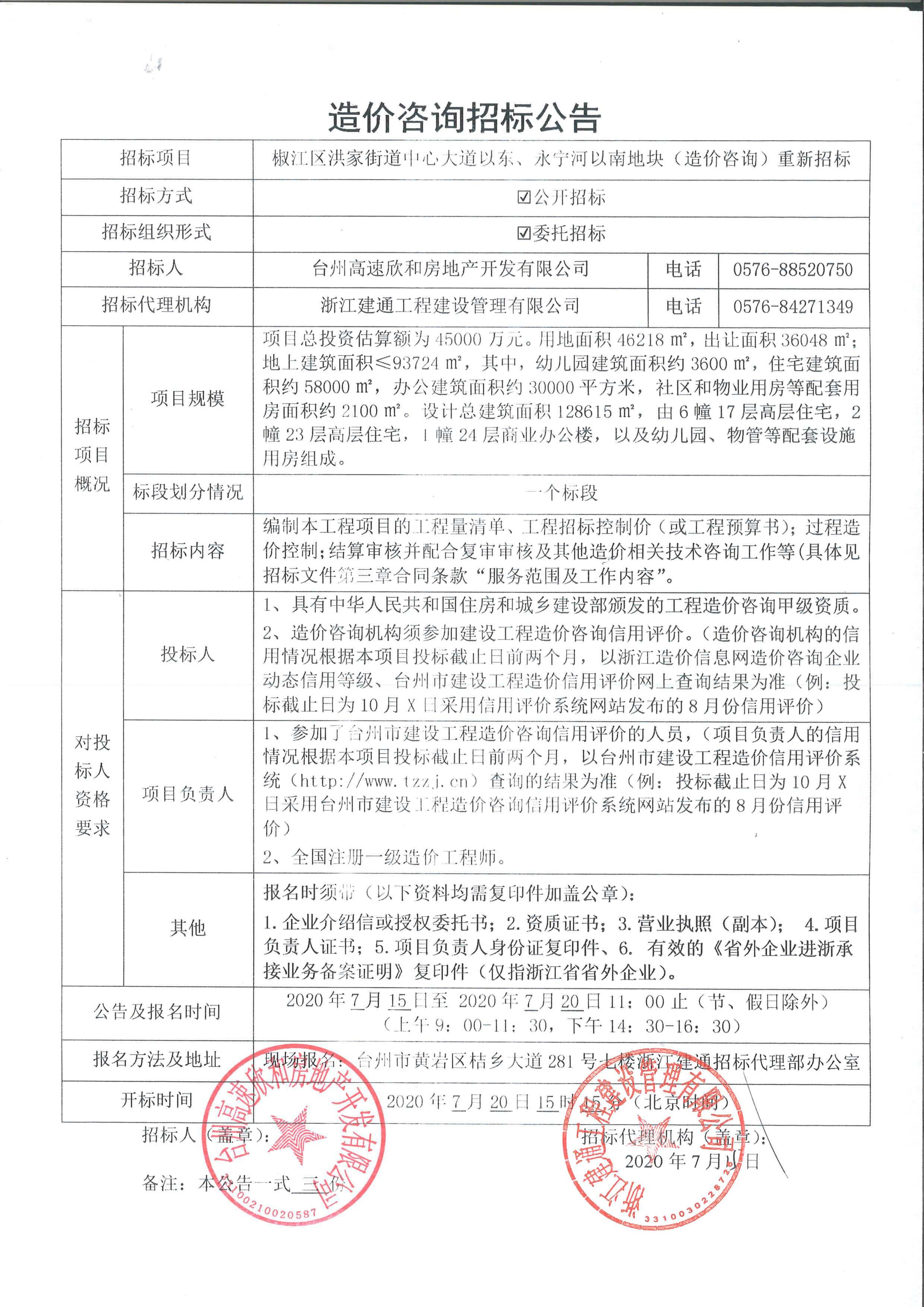 椒江區(qū)洪家街道中心大道以東、永寧河以南地塊(造價咨詢)重新招標(biāo)公告