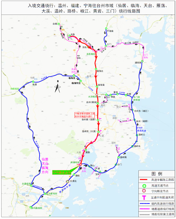 (3)溫州、福建往仙居、臨海、天臺線路:通過甬臺溫高速→溫州繞城高速→諸永高速→臺金高速→①仙居走仙居互通下高速;②臨海走臨海市區下高速;③天臺走臨海西下高速至G104國道;④重新回到G1522常臺(上三)高速建議臨海西下高速→G104國道→白鶴互通上高速。
