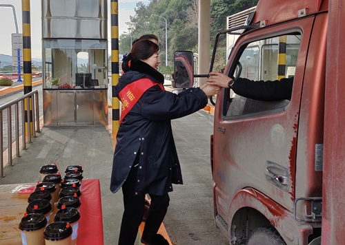 活動(dòng)當(dāng)天,雖然氣溫較低,但是在臨海南收費(fèi)所入口處,身著紅色綬帶的志愿者們依然熱情地為過往司乘人員遞上一杯杯滾燙的姜茶,并向過往大貨車駕駛員發(fā)放優(yōu)惠政策宣傳單。