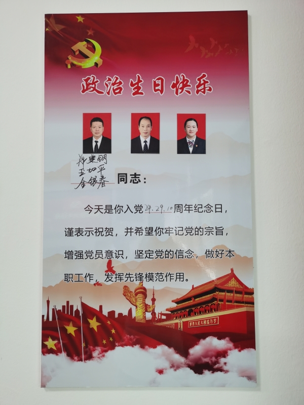 王加平、鄭建鋼分別是有著29年、24年黨齡的老黨員,他們向其他黨員分享了各自入黨以來的心路歷程,從工作中的細微處做起,深刻檢討自己在發揮黨員先鋒模范作用上做的不足之處,激勵和鞭策自己。他們一句句質樸的語言,讓我們走進了他們的生活,感受了他們不忘初心的激情歲月。在活動過程中,支委成員為過生日黨員贈送了賀卡。