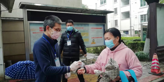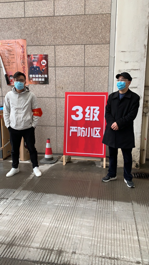 黨員包啟曉,在星洲小區(qū)援助社區(qū)逐家逐戶發(fā)放通行卡,并多次參與社區(qū)卡點測溫志愿服務。